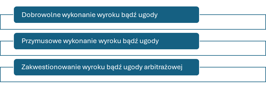Wydanie wyroku przez arbitrów, bądź zawarcie przed nimi ugody może prowadzić do: (1) dobrowolnego wykonania wyroku/ugody przez stronę przegrywającą (w całości bądź w części co do dochodzonego przez przeciwnika roszczenia), (2) przymusowego wyegzekwowania roszczenia, które zostało stwierdzone przez arbitrów w wyroku, bądź ugodzie.