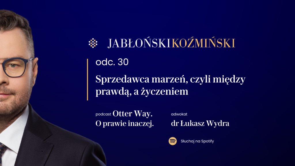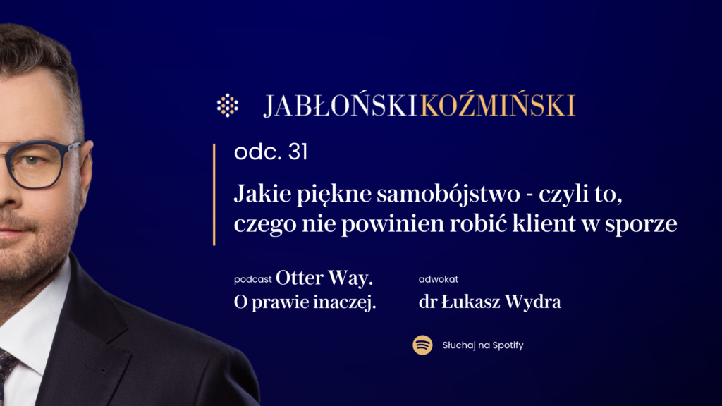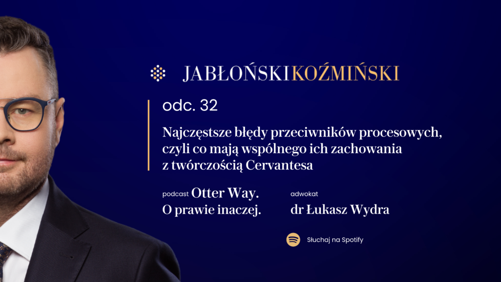 Czy adwokat to tylko „ratownik” na sytuacje kryzysowe, czy może raczej – zaufany przewodnik, strateg, architekt bezpieczeństwa? W najnowszym, 18. odcinku naszego procesowego podcastu dr Łukasz Wydra – Partner w Kancelarii Jabłoński Koźmiński i Wspólnicy i Lider praktyki arbitrażu zaprasza do refleksji nad rolą prawnika we współczesnym świecie – od etycznych dylematów, przez literacko-filmowe wzorce, aż po rzeczywistość biznesową.